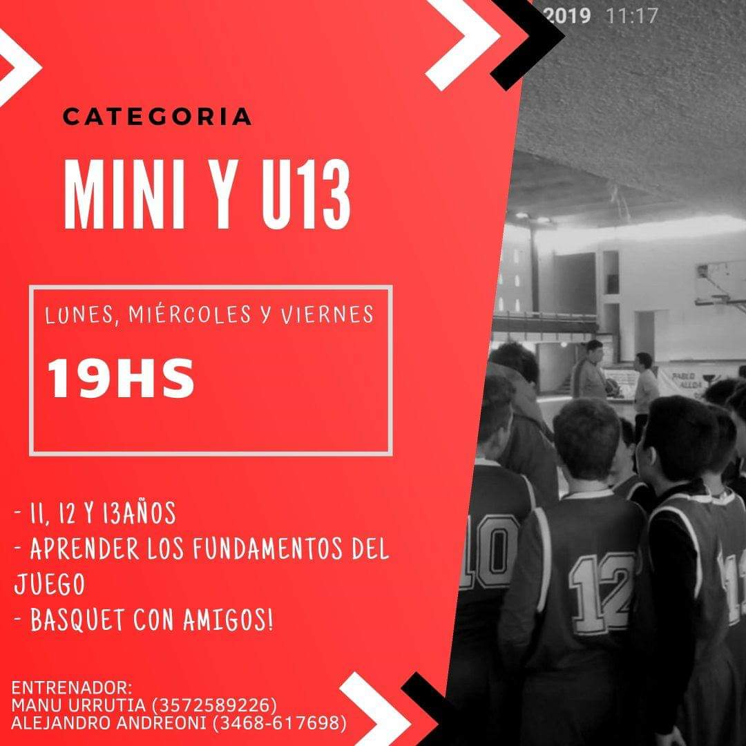 - Cat. Mini y U13 (11, 12 y 13 años) Lunes, Miércoles y Viernes a las 19 hs.