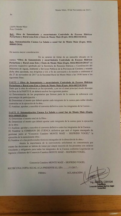 En su carácter de titular de un inmueble ubicado en la cuenca obra de saneamiento y escurrimiento controlado de excesos hídricos periurbanos rural de zona este y oeste de Monte Maíz en proyecto respectivo aprobado por la Secretaria de Recursos Hídricos y Coordinación del Ministerio de Agua, Ambiente y Servicios Públicos de la Provincia de Córdoba y estando dicha obra ejecutada, nos dirigimos a ustedes a fin de convocar a la reunión a celebrarse el día 27 de noviembre de 2017 en la Sociedad Rural de Monte Maíz a las 19:00 horas a los siguientes fines: