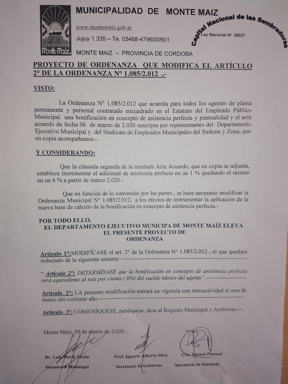 En Sesión Ordinaria del Honorable Concejo Deliberante de Monte Maíz del martes 10 de marzo se aprobó por unanimidad la rectificación del Art. 2 de la Ordenanza 1085/12. La misma establecía un porcentaje del 5% del sueldo básico del empleado Municipal como bonificación por asistencia perfecta y puntualidad.