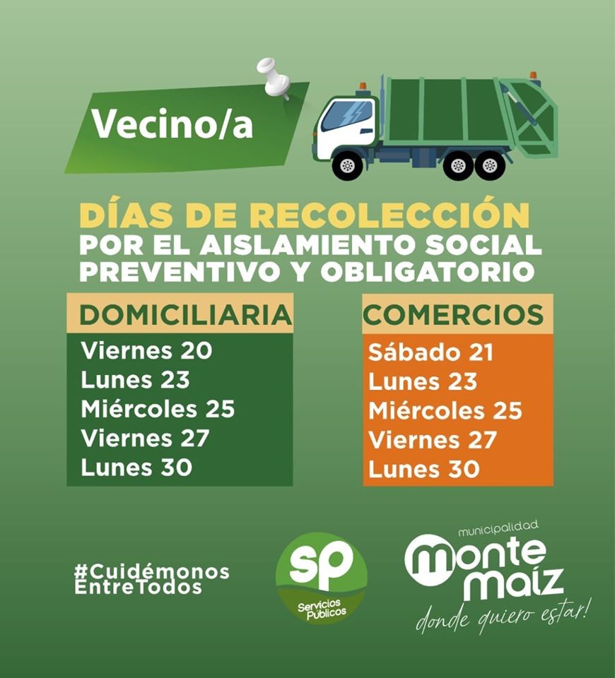 La Municipalidad de Monte Maíz a través de la Secretaría de Servicios Públicos estableció un cronograma de recolección de residuos durante la Cuarentena.