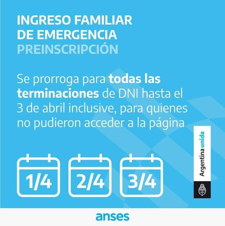 La prórroga es válida para todas las terminaciones de DNI y será desde mañana 1° de abril hasta el viernes 3 de abril inclusive. Las inscripciones se deben hacer a través de la Página Oficial de ANSES:  anses.gob.ar.