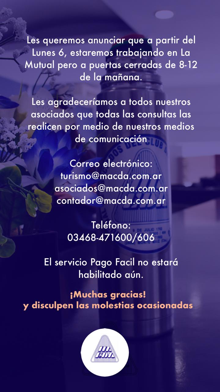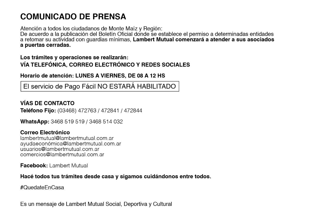 En nuestra localidad, ambas Mutuales: Lambert Mutual, Social, Deportiva y Cultural y la Mutual de Asociados del Club Deportivo Argentino, comienzan a trabajar desde este lunes aunque a puertas cerradas. Sin atención personalizada. Lo harán solo vía whatsapp o llamadas telefónicas y vía correo electrónico. El horario de atención será solo de 08:00 a 12:00 hs.