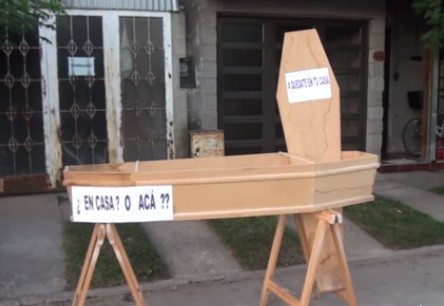 “En tu casa o acá” reza el mensaje pegado en un ataúd que sacó como símbolo a la vereda para concientizar a la gente sobre la necesidad del aislamiento obligatorio.