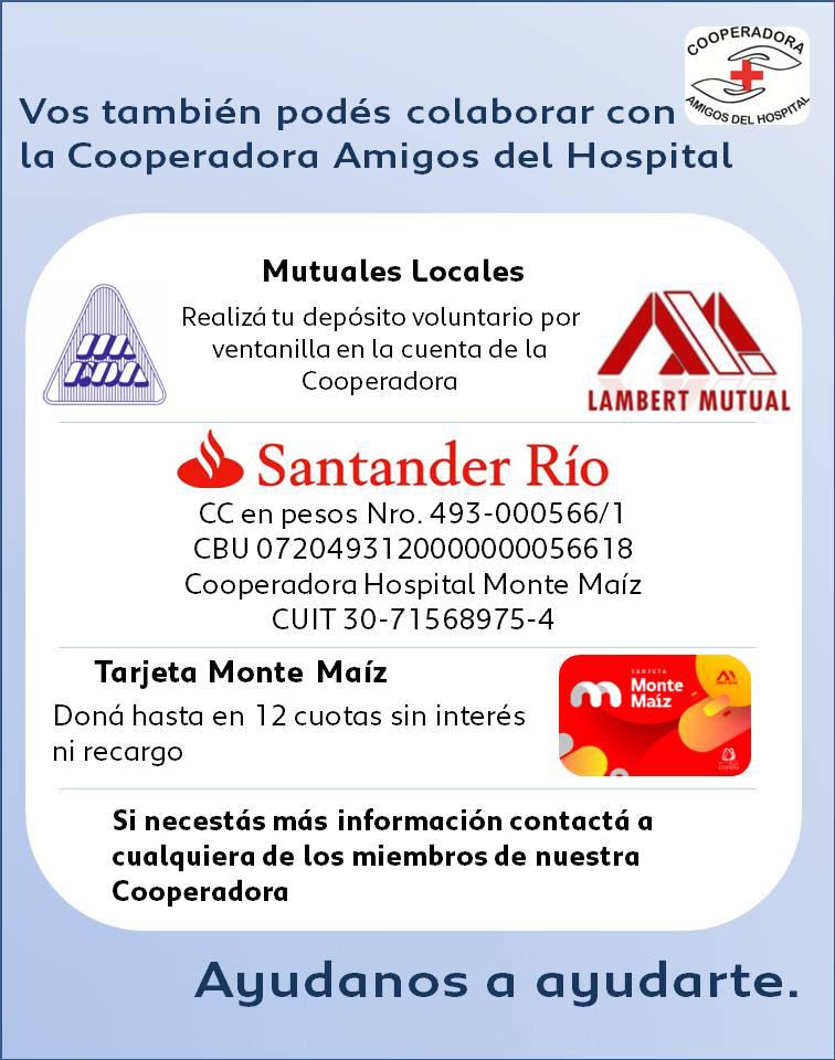 Podemos recibir las donaciones con sobre cerrado a los miembros de la Cooperadora, o por depósito o transferencia en Banco Santander Río, Depósito de caja de ahorro en Mutual De Asociados Club Deportivo Argentino y en Lambert Mutual o también con Tarjeta Monte Maíz que podes abonar en 12 cuotas.-