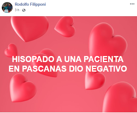 A través de su cuenta de Facebook, el Intendente de Pascanas, Rodolfo Filipponi, confirmó que el resultado del hisopado que se le hizo a una mujer que falleció en la mañana de hoy, dio NEGATIVO.