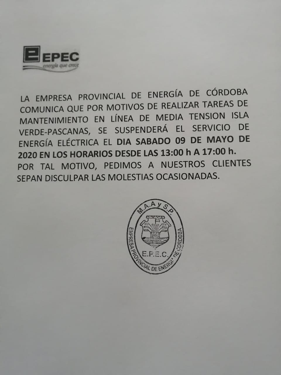 La Empresa Provincial de Energía de Córdoba EPEC comunica que por tareas de mantenimiento en la línea de Media Tensión Isla Verde - Pascanas realizará un Corte de Servicio el sábado 9/5 desde las 13 hasta las 17 Hs.