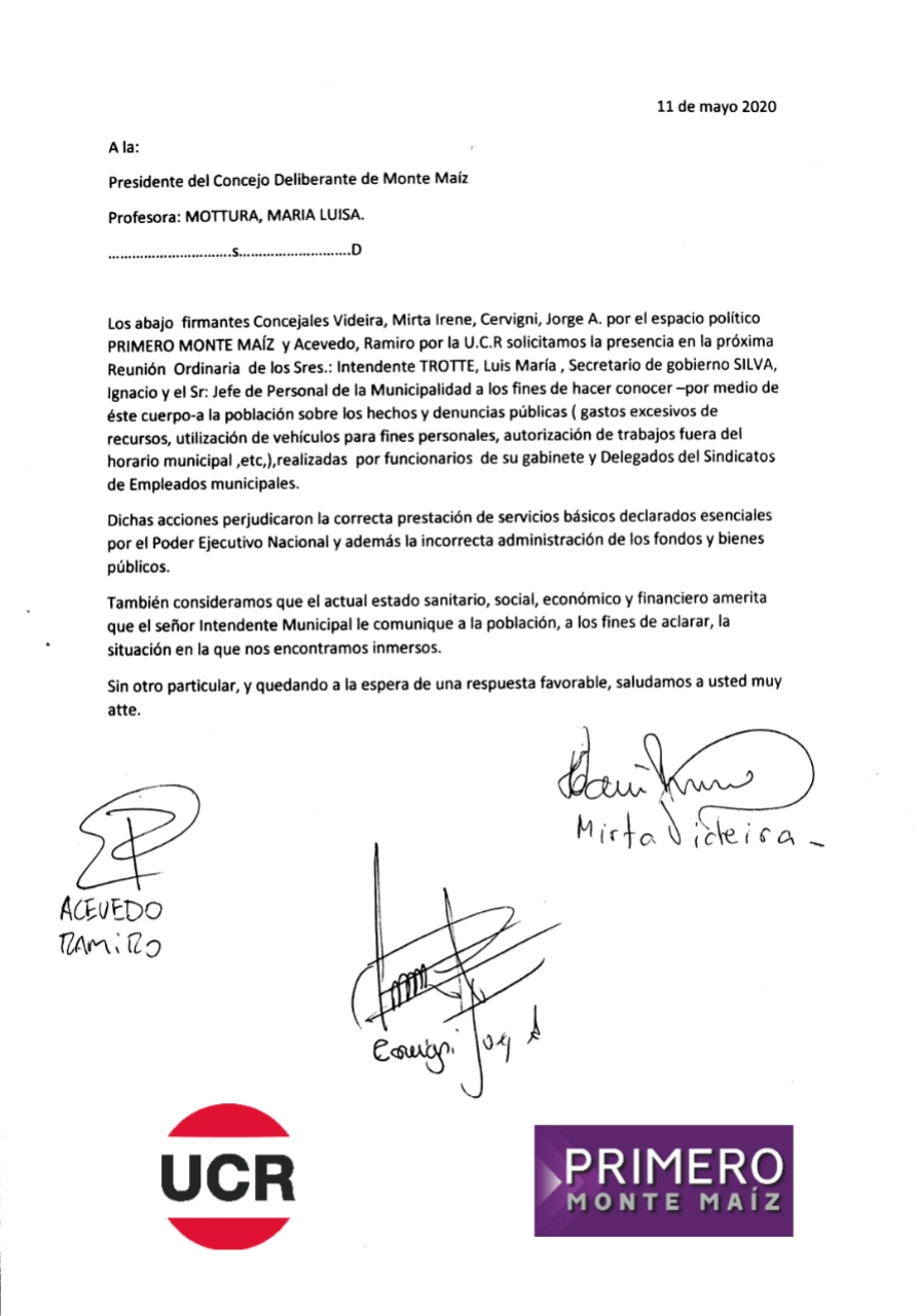 A continuación citamos lo declarado en la cuenta de Facebook de Primero Monte Maíz y la nota presentada ayer en el Concejo: