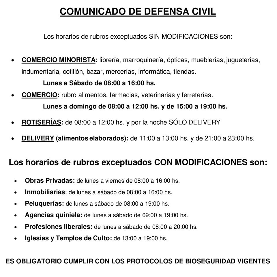 Tras una reunión de Defensa Civil que tuvo lugar el miércoles por la noche en la Casa de la Cultura y de la Historia del Bicentenario se emitió un comunicado oficial sobre los horarios de las actividades flexibilizadas hasta el día de la fecha.