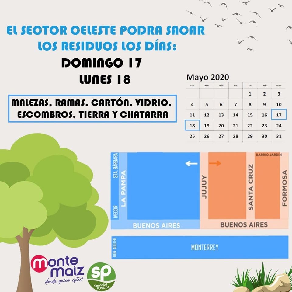 La Municipalidad de Monte Maíz, a través de la Secretaría de Servicios Públicos, informa a la población que los días domingo 17 y lunes 18 de mayo los vecinos de B° Monterrey (completo) y del Centro hacia el oeste (desde calle Jujuy hasta La Pampa) podrán sacar malezas a la vía pública (malezas, ramas, cartón, vidrios, escombros, tierra y chatarra).