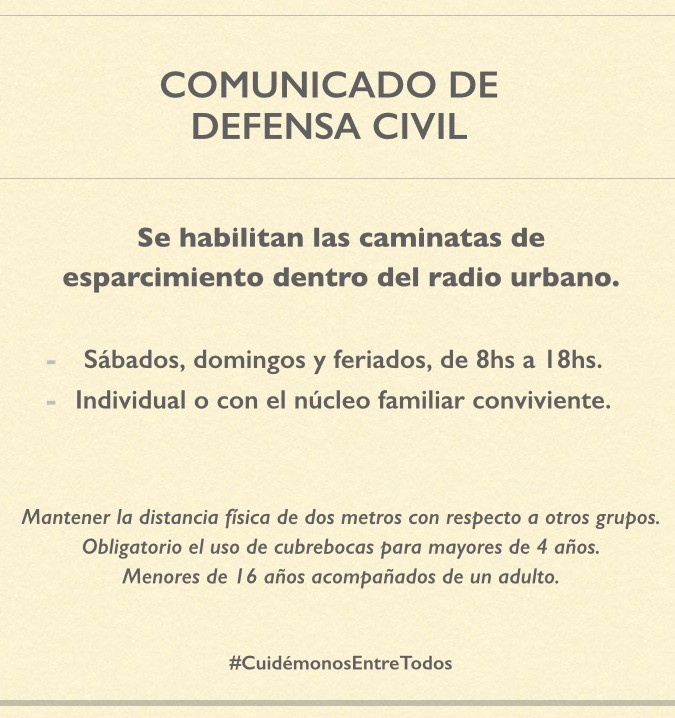 Defensa Civil de Monte Maíz anunció este mediodía mediante un comunicado oficial que adhiere a las caminatas de esparcimiento en el radio urbano.