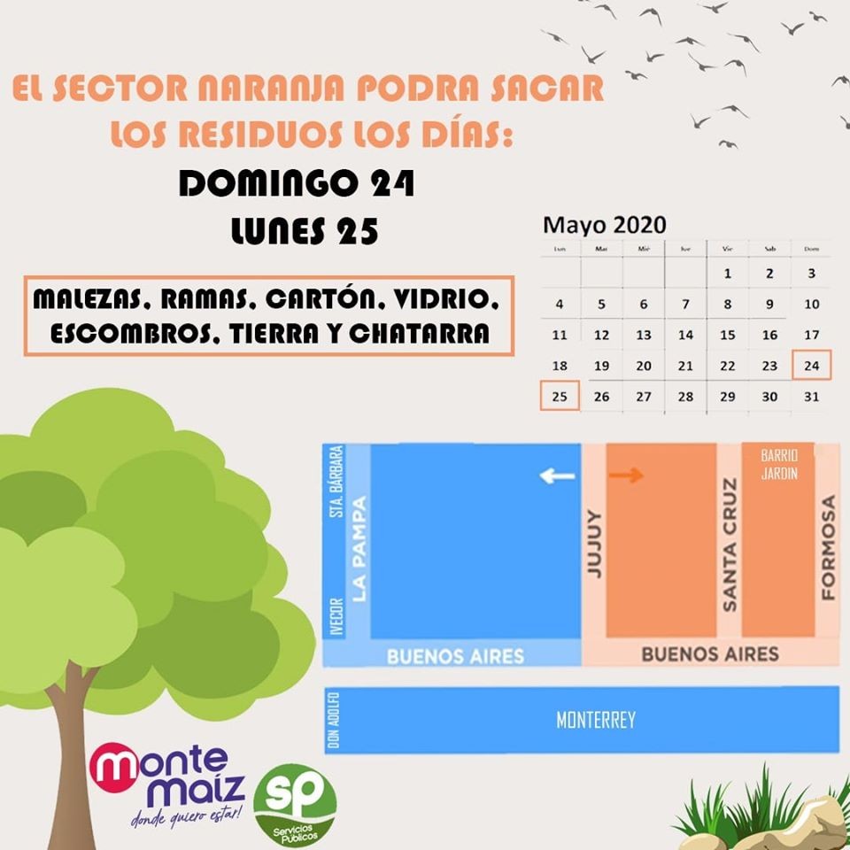 La Municipalidad de Monte maíz informa a la población que los días domingo 24 de mayo y lunes 25 de mayo los vecinos del sector este- noreste del pueblo podrán sacar malezas, ramas, cartón, vidrios, escombro, tierra y chatarras.