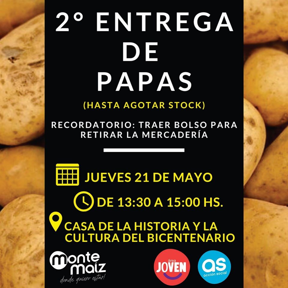 Hoy jueves 21 de mayo se lleva a cabo la 2° jornada de entrega de papas para todas las familias de Monte Maíz. Tal entrega se realizará en la Casa de la Cultura entre las 13:30 y las 15:00 hs.