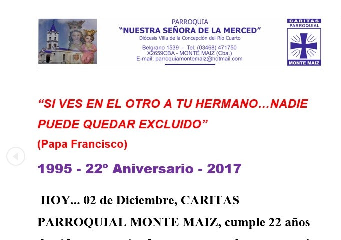 HOY... 02 de Diciembre, CARITAS PARROQUIAL MONTE MAIZ, cumple 22 años de vida compartiendo con nuestros hermanos más necesitados el amor de caridad.