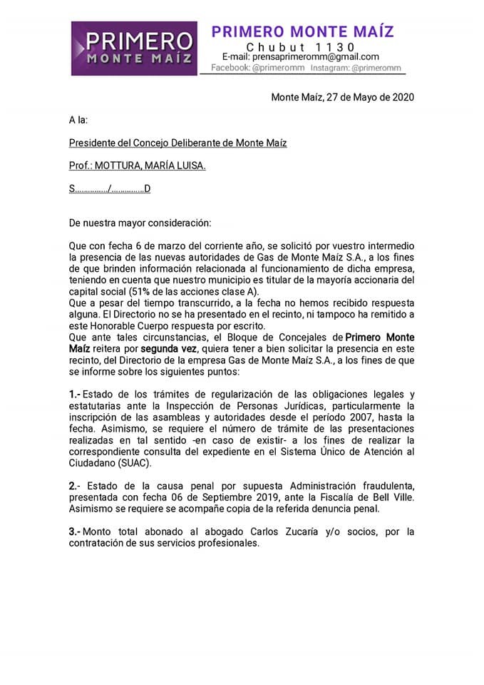 Primero Monte Maíz se dirigió a la Presidenta del Honorable Concejo Deliberante, Prof. María Luisa Mottura, a los fines de recordarle que el día 6 de marzo del corriente año se pidió que se hicieran presentes las autoridades de Gas de Monte Maíz S.A. en el Recinto para que brinden un informe sobre el funcionamiento de la empresa.