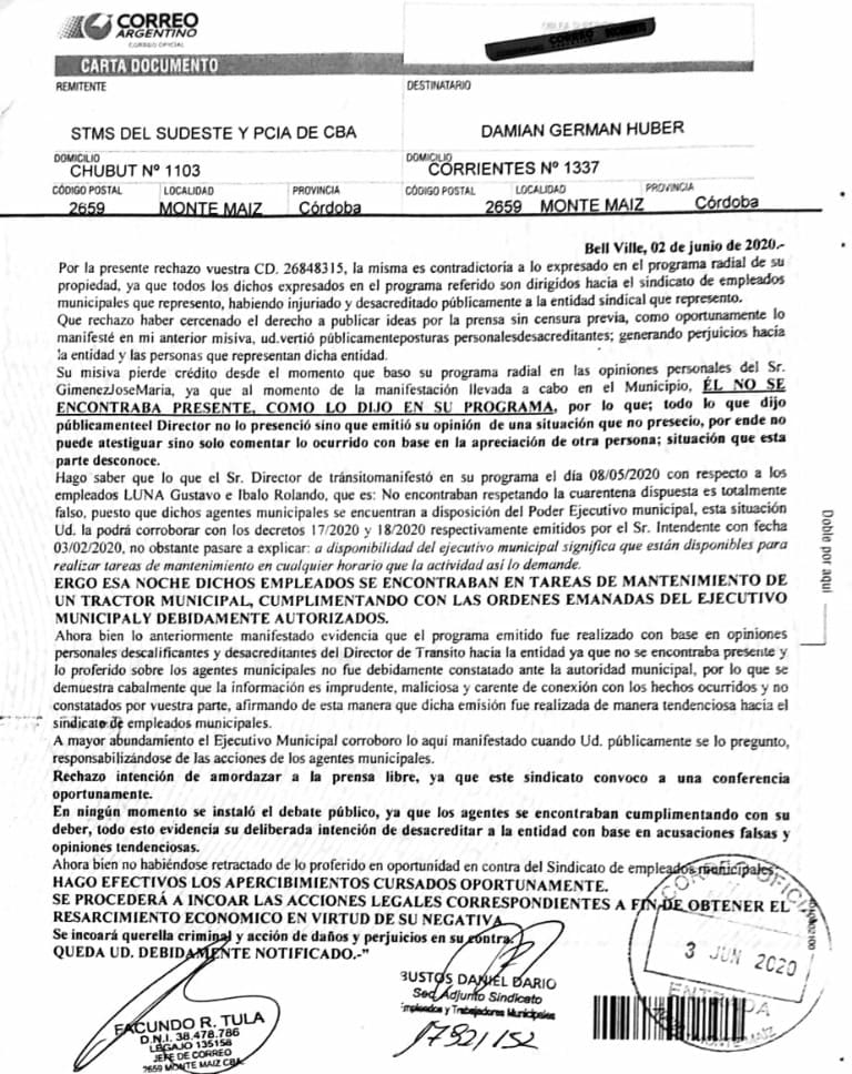 “La emisora Radio Sintonía 102.5 de Monte Maíz recibió en 15 días la segunda carta documento por parte del Sindicato de Empleados Municipales aludiendo sentirse agraviados por la nota que el periodista Damián Huber realizó al Director de Tránsito José María Giménez y a su colaborador Marcelo Romani.