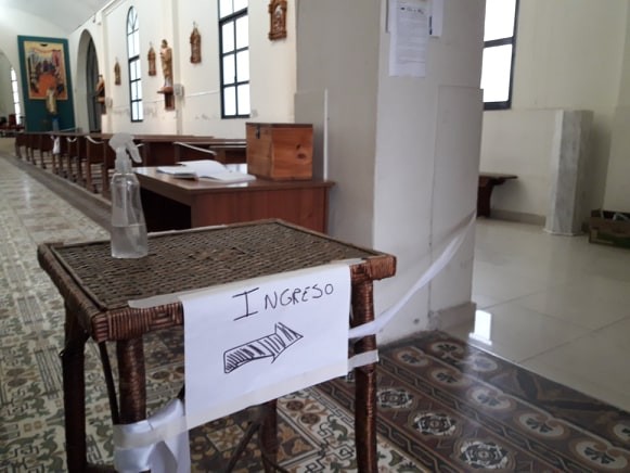 En la entrada del Templo se colocó una mesita con alcohol en gel para la higienización de manos en el ingreso y a la salida.