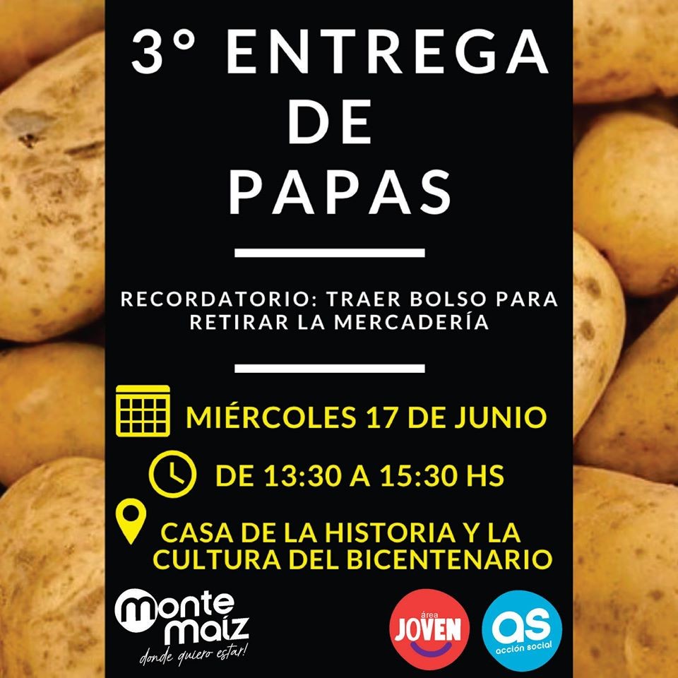Esta tarde desde las 13:00 hs. se hará la tercera entrega de papas de este año 2020. La misma será en la Casa de la Cultura y de la Historia del Bicentenario para familias de Monte Maíz.