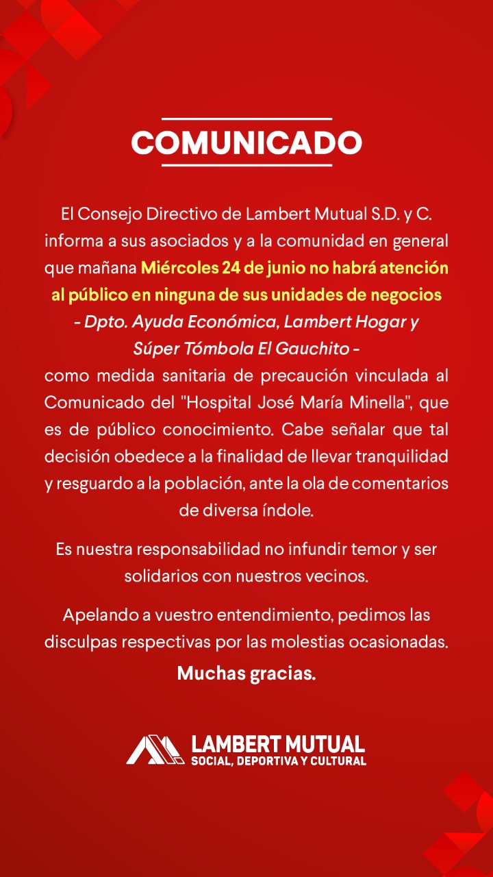 El Concejo Directivo de Lambert Mutual, Social, Deportiva y Cultural informa a sus asociados y a la comunidad en general que hoy miércoles 24 de junio no habrá atención al público en ninguna de sus unidades de negocios.