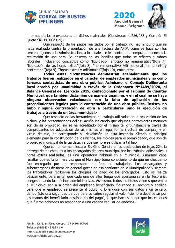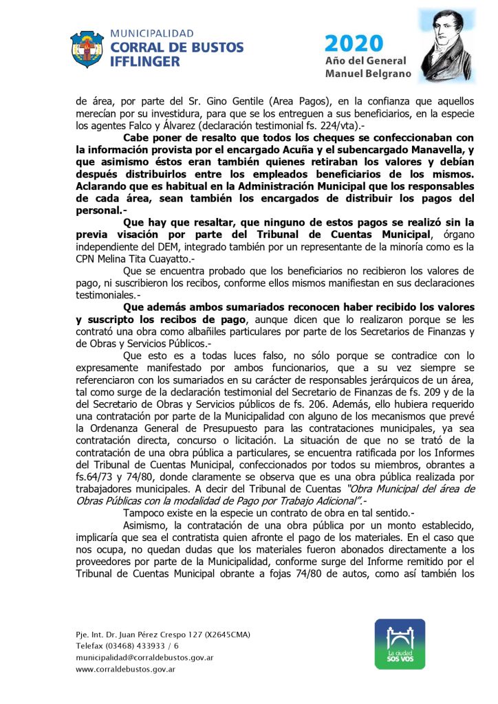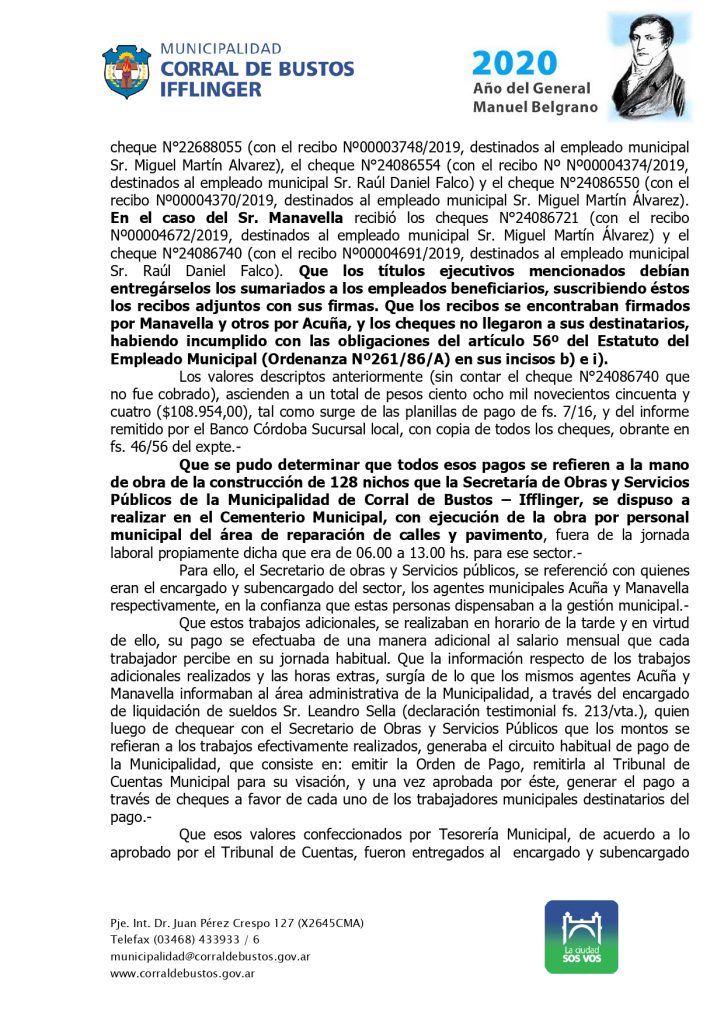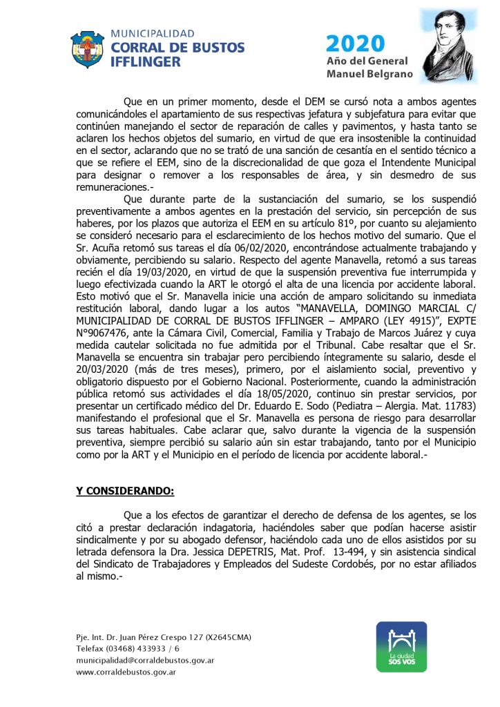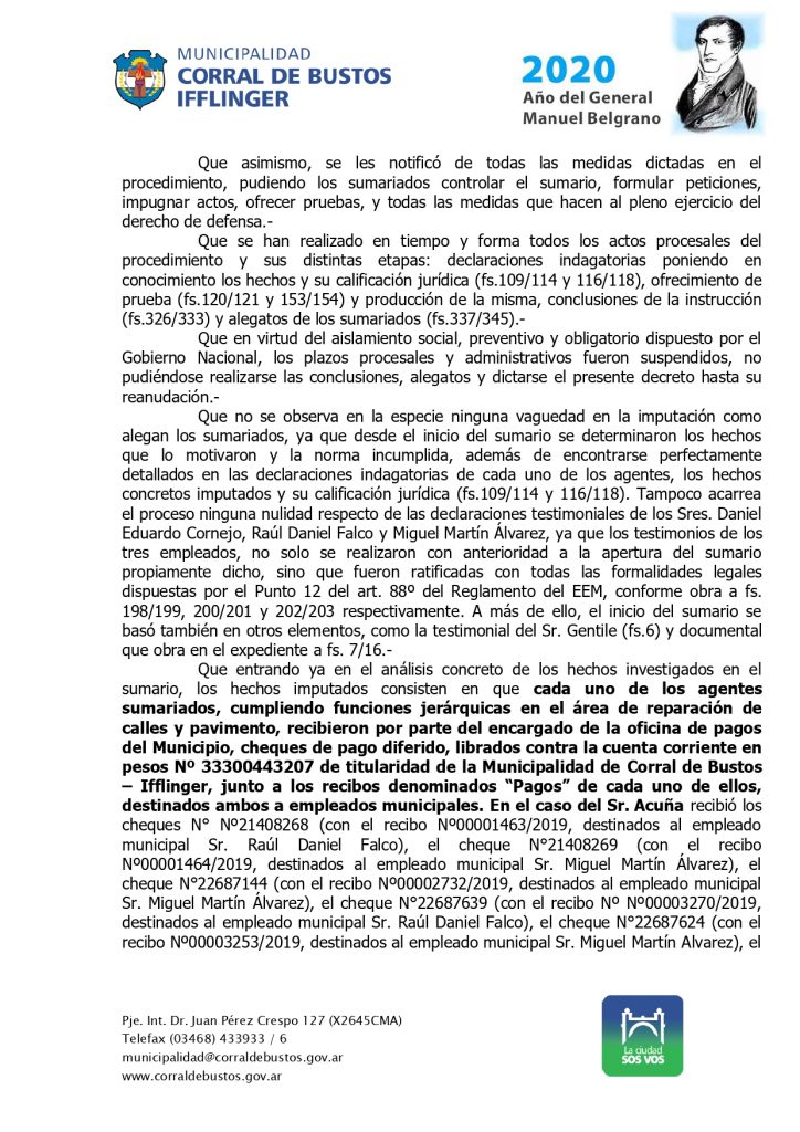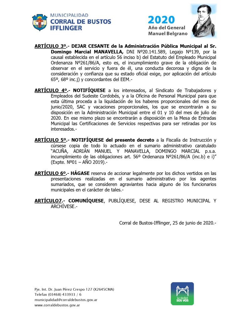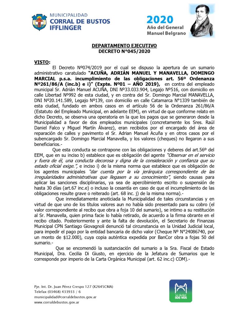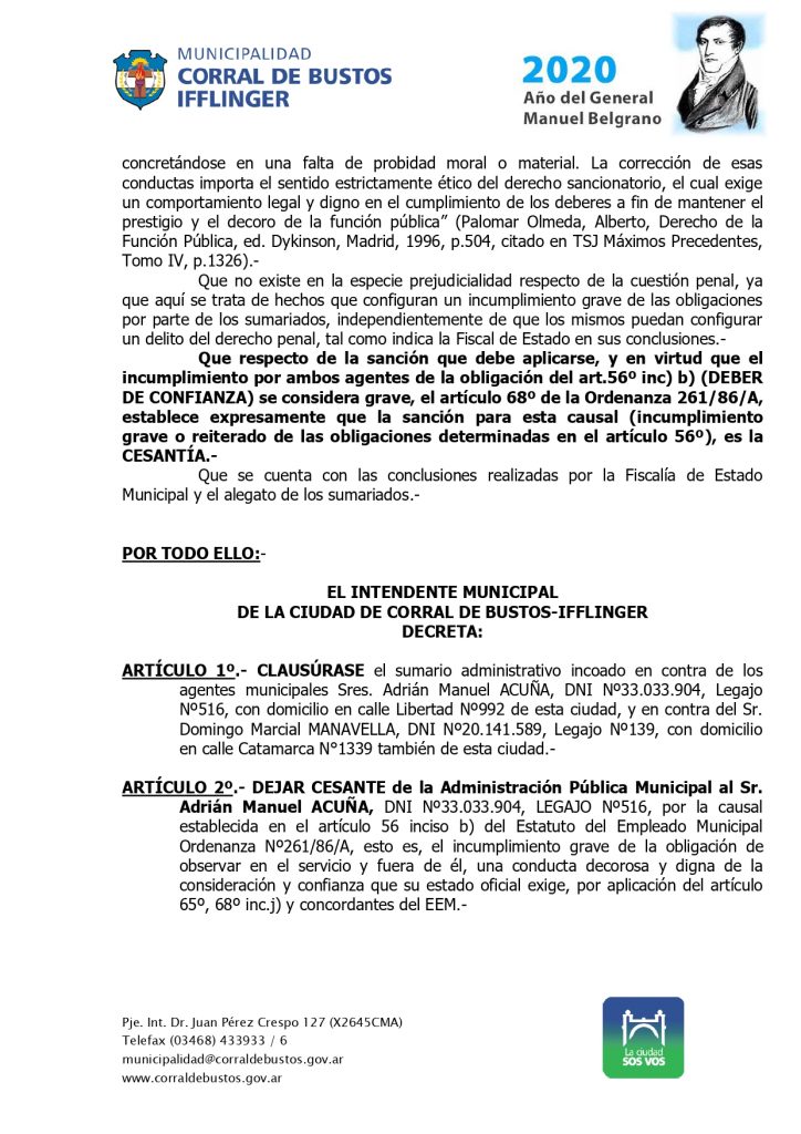 Tras esa determinación, el Ejecutivo Municipal redactó el decreto 045/2020, en el establece los fundamentos de la medida, da por CLAUSURADO el sumario administrativo y DEJA CESANTE de la administración pública municipal a dos agentes que se desempeñaban en el ámbito de la Secretaría de Obras y servicios Públicos.