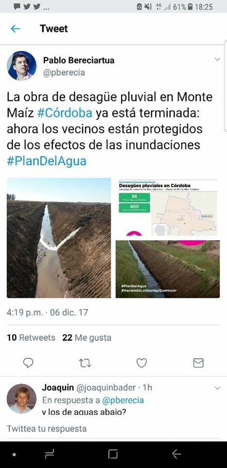El Presidente del Consorcio Canalero Sigfrido Vogel de Monte Maíz, Ing. Jorge Cervigni, repudió enérgicamente los dichos del Subsecretario de Recursos Hídricos de la Nación, Ing. Pablo Bererciartua, quien adjudica una obra de canalización que se hizo en nuestra localidad en favor del Gobierno Nacional a través del Programa “Plan del Agua” del Ministerio del Interior, Obras Públicas y Vivienda. Tal situación fue publicada en la Red Social Twitter a través de la cuenta personal del Funcionario de la Gestión de Mauricio Macri. En declaraciones a Radiolínea, Jorge Cervigni expresó: “Lo que ha twiteado este Funcionario es completamente falso. Querer adjudicarse una obra que le ha costado tanto a nuestro pueblo es no conocer la realidad en que vivimos. Luego de una larga lucha este desagüe se terminó en poco más de dos años pero nada tuvo que ver con el Gobierno Nacional. Hubo que gestionar y explicar mucho acerca de la utilidad y de la necesidad de esta obra para el sector rural y para la zona urbana también. Puede ser que esté mal asesorado también porque incluso da datos que no se condicen con las utilidades y beneficios de este canal a cielo abierto. A mí esta publicación me cayó malísimamente mal. Sobre todo porque falta a la verdad. Él habla más de 50 hectáreas recuperadas cuando la cuenca afectada al canal son más de 9.000 hectáreas y las que se recuperaron son más de 900. Uno que conoce los pormenores de la obra se da cuenta que las fotos publicadas han sido tomadas recientemente en la parte de la obra que pasa a la vera de la ruta Provincial N° 11. Nosotros hacemos este repudio porque consideramos que lo que dice este señor no corresponde”, concluyó.