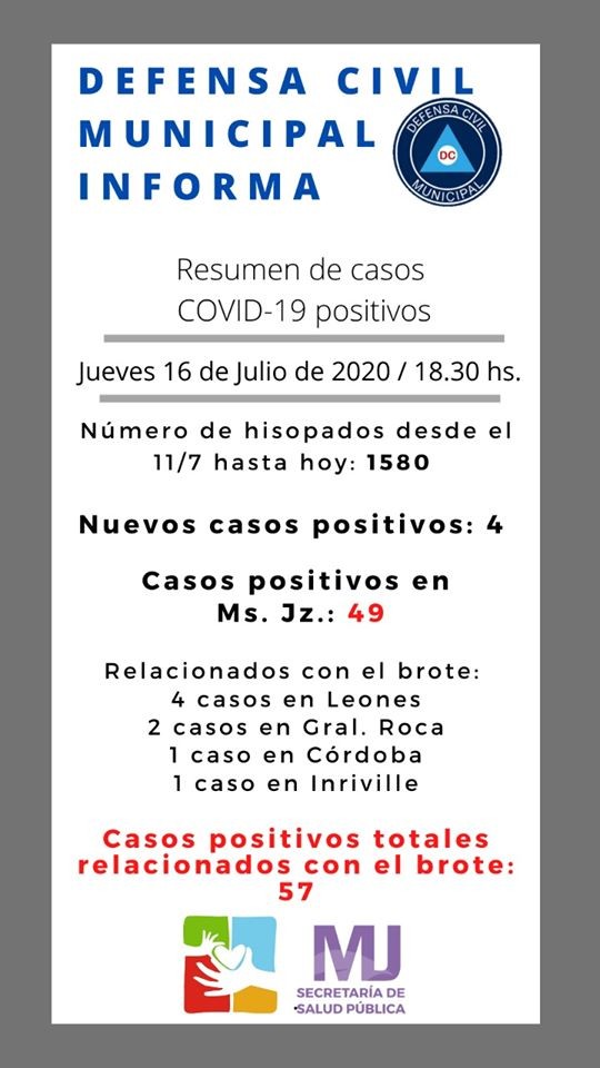 De esta manera el número de contagios asciende a 49. Así mismo se informó también que desde el 11 de julio hasta hoy se hicieron 1580 hisopados. Hay 8 casos más que están relacionados con este brote. 4 casos en Leones; 2 casos en general Roca; 1 en Córdoba y 1 en Inriville.