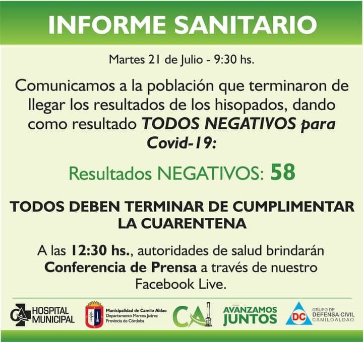 Este martes por la mañana, autoridades Municipales de Camilo Aldao dieron a conocer los resultados de los hisopados que se hicieron de manera preventiva en esa localidad luego del caso de COVID-19 Positivo que se registró tras la visita de un joven con domicilio en Marcos Juárez.