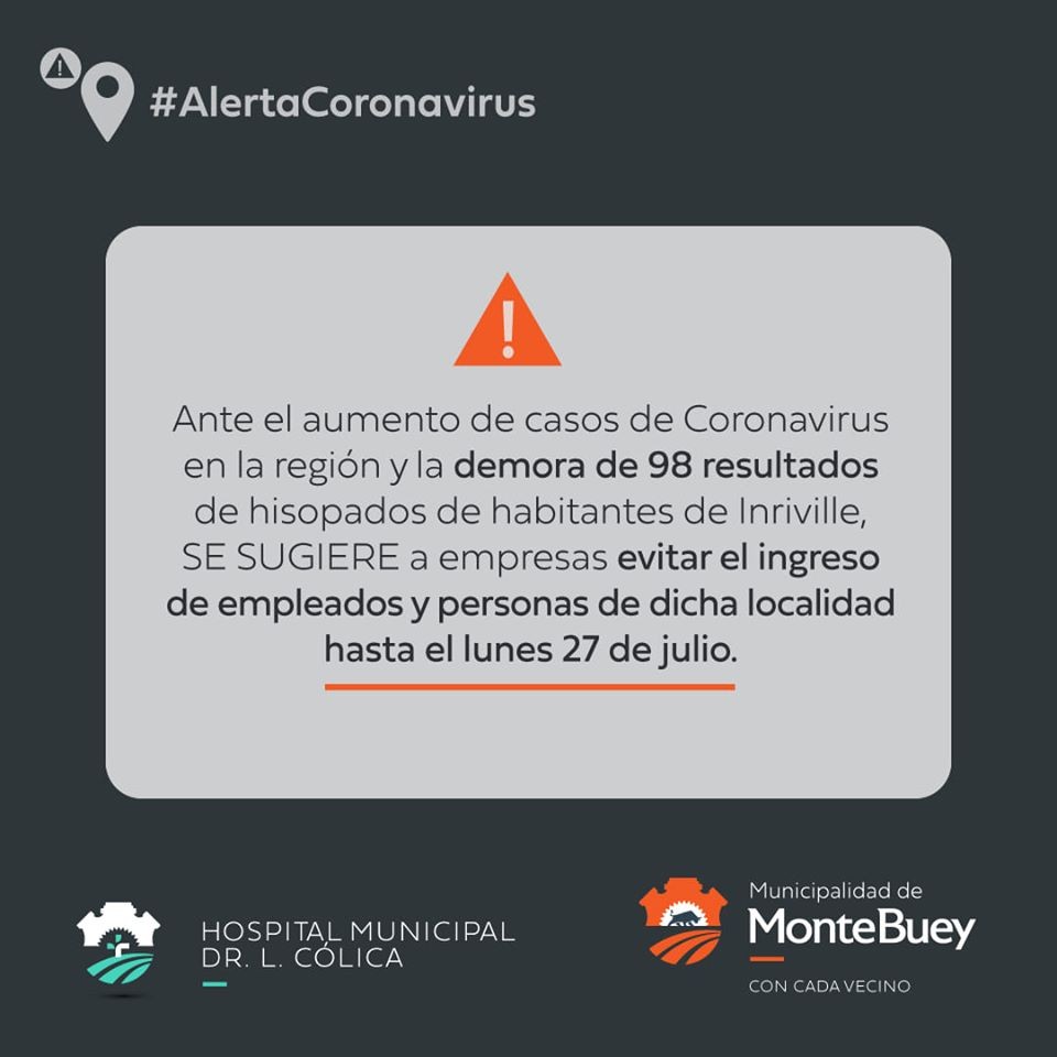 La Municipalidad de Monte Buey y el Hospital de esa localidad le pidieron a las empresas que no permitan el ingreso de trabajadores de Inriville ya que están demorados los resultados de 98 hisopados.