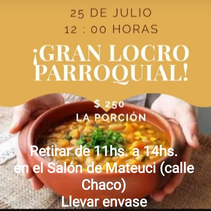 Mañana sábado 25 de julio se hace el locro de la Parroquia. De 10:00 a 11:00 hs. por la mañana y de 17:00 a 19:00 hs. se puede encargar la porción en la Secretaría Parroquial. Del mismo modo, se puede adquirir la porción ese mismo sábado por la mañana en el salón de Fabián Mateucci en B° Monterrey, calle Chaco entre Jujuy y Córdoba.