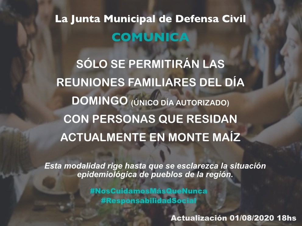 En la tarde del sábado la Junta Municipal de Defensa Civil informó que solo se permiten las reuniones familiares del día domingo (único día autorizado) con personas que residan actualmente en Monte Maíz.