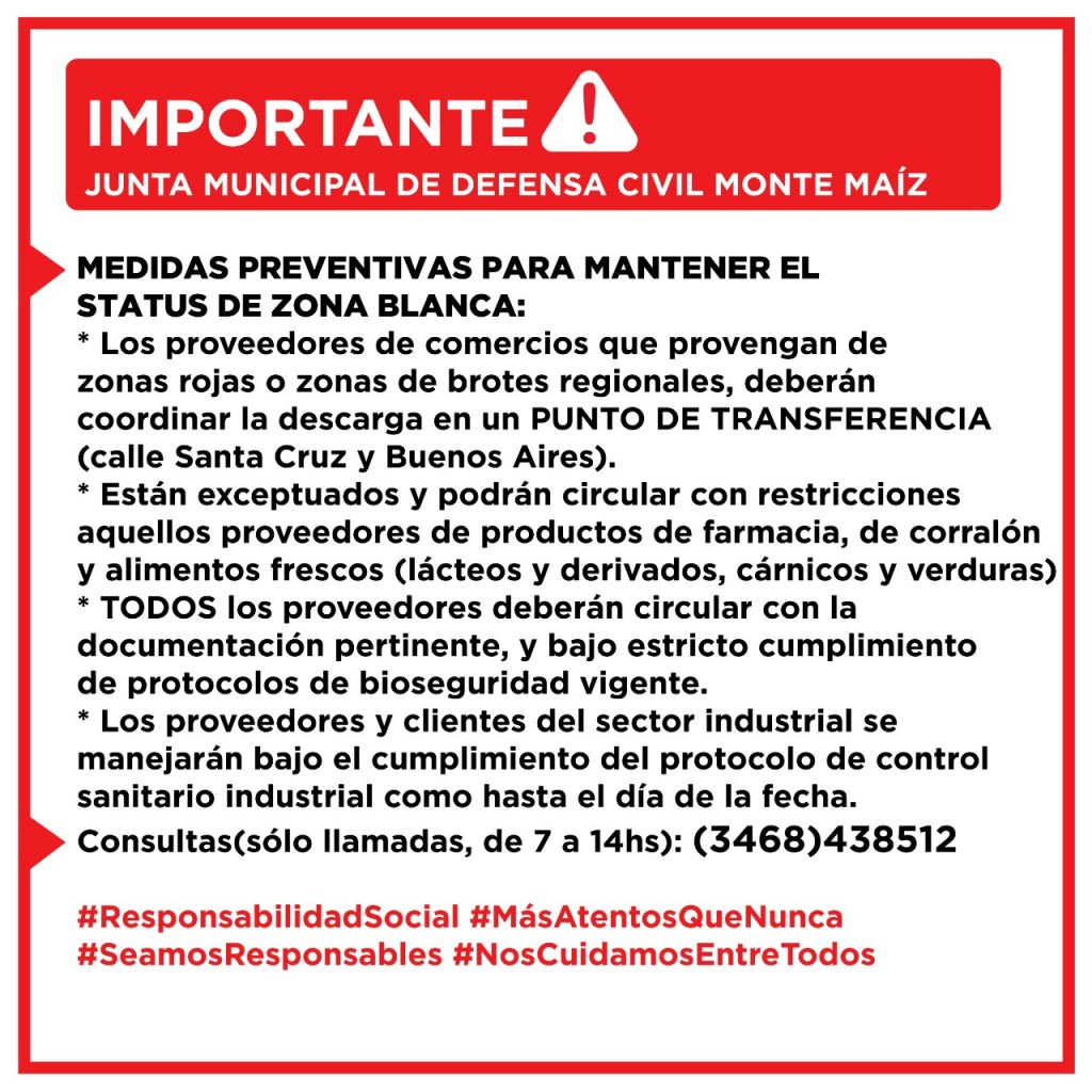 Debido a la situaci�n que atraviesa nuestra zona con los casos de COVID-19 se contin�a tomando medidas de prevenci�n tendientes a evitar el ingreso del virus a Monte Ma�z.