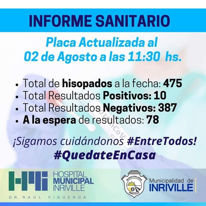 En la mañana del domingo la Municipalidad de Inriville confirmó tres resultados Positivos para COVID-19. Loa mismos se suman a los 7 ya existentes alcanzando un total de 10 personas contagiadas.
