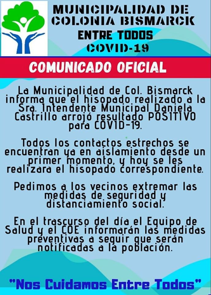 La Municipalidad de Colonia Bismarck confirm� esta ma�ana que el hisopado que se le practic� a la Sra. Intendenta, Daniela Castrillo, dio resultado Positivo.