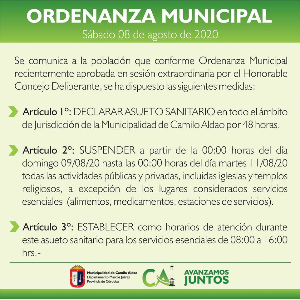 La localidad de Camilo Aldao, con 6 casos de COVID-19 Positivos, está al aguardo de 27 resultados. Mientras tanto, se sancionó una nueva Ordenanza Municipal que establece un asueto sanitario por 48 hs. debido a la cantidad de contactos de los casos Positivos.