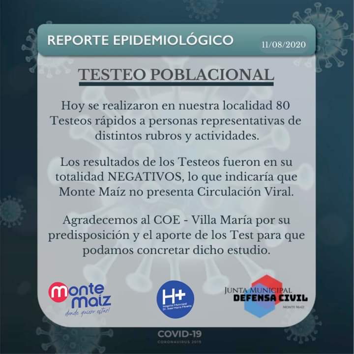 En la tarde de este martes se confirmaron 4 casos más de COVID-19 en Monte Maíz de los 5 hisopados que se habían practicado ayer lunes. Uno de ellos dio Negativo. A la fecha hay 13 casos activos de coronavirus en nuestra localidad.