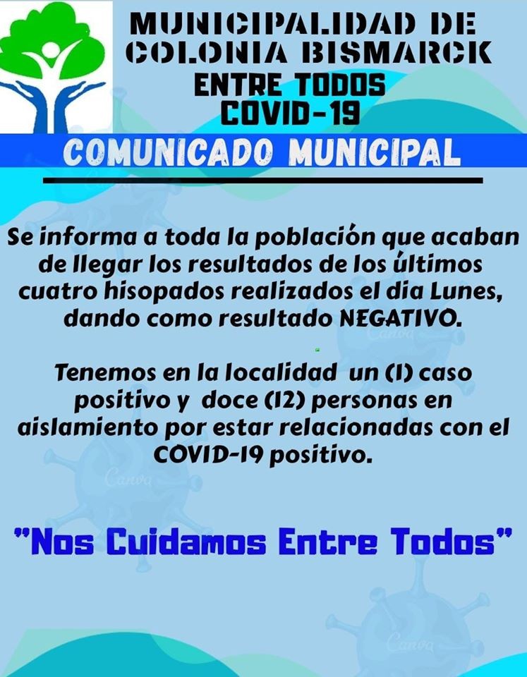 La Municipalidad de Colonia Bismarck informó a través de un comunicado oficial que en la tarde de este miércoles llegaron los resultados de 4 hisopados que se practicaron el lunes. Los mismos arrojaron resultado Negativo.