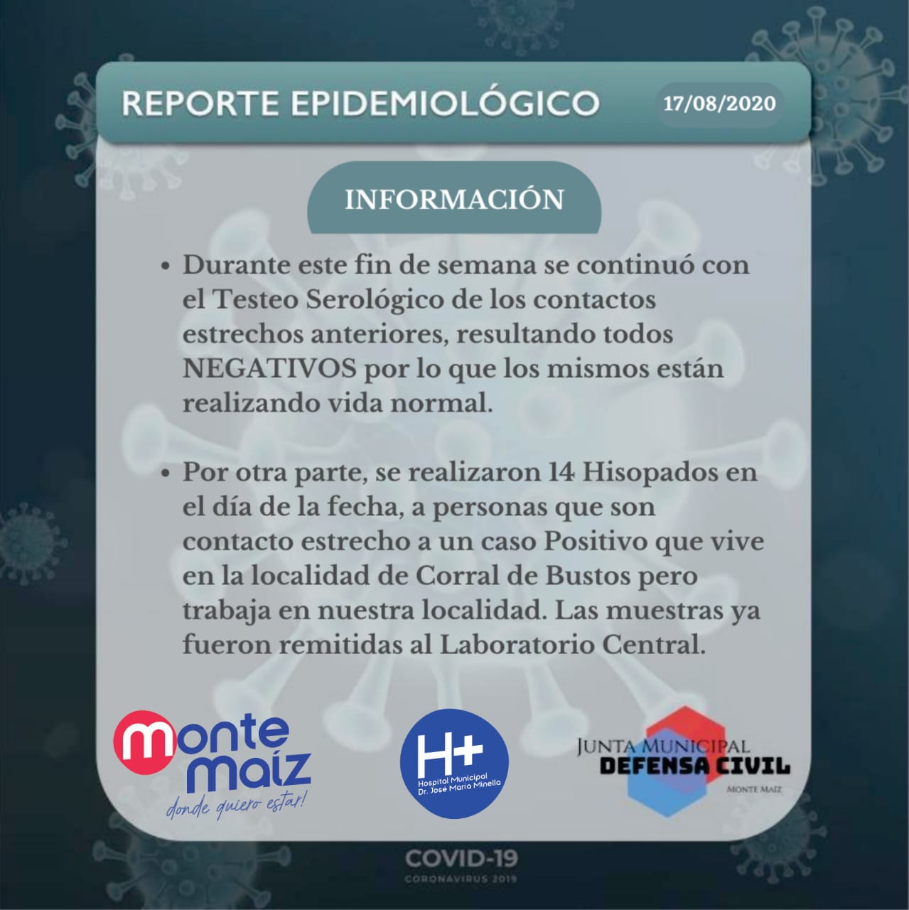 En la tarde del lunes se informó desde el Hospital Municipal Dr. José María Minella que se practicaron 14 hisopados a contactos estrechos de un caso de COVID-19 Positivo que es de Corral de Bustos pero que trabaja en Monte Maíz.