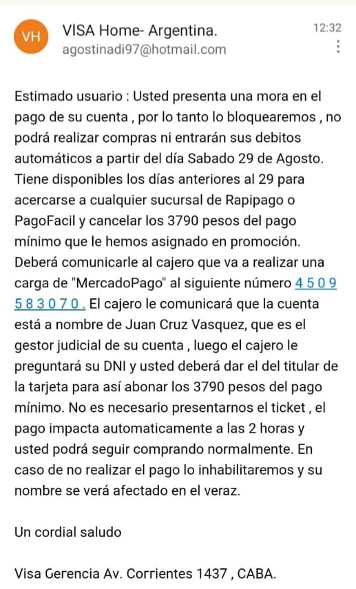 Se trata de una nueva modalidad de “Cuento del Tío”. En esta ocasión el mensaje le decía a la posible víctima que poseía una deuda con Tarjeta Visa y que podría comenzar a regularizar la situación mediante un pago mínimo de $3.790 que debería concretar antes del 29 de agosto. De lo contrario ingresaría en el Veráz. El número de cuenta que debía informar al cajero corresponde a Mercado Pago, N° 4509583070, a nombre de Juan Cruz Vázquez.