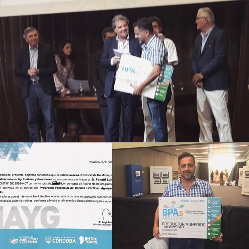 El Ingeniero Agrónomo Luis Pablo Panatti de Monte Maíz fue distinguido por el Ministerio de Agricultura de Córdoba por Buenas Prácticas Agropecuarias: “Es un reconocimiento a productores rurales que ingresan a este Programa y cumplen con ocho requisitos; entre ellos, planes de conservación de suelo en el campo, confección de la receta fitosanitaria, fertilización de suelo, entre otros. A partir de esto se arma un plan de prácticas que debe ser enviado al Ministerio de Agricultura. Allí hay una Junta Evaluadora que califica y envía los resultados al Gobierno. Luego los puntajes más altos son premiados con un certificado por adhesión al Programa y con un incentivo económico para seguir trabajando de la misma manera. Hay 3.300 productores adheridos al Programa y se ha reconocido, hasta ahora, a unos 400. La idea del Gobierno Provincial es que la mayoría de los productores rurales de la Provincia de Córdoba realicen estas buenas prácticas agropecuarias y por eso los incentiva de esta manera. Esto lo puede hacer cualquier productor ingresando a través de la Plataforma “Ciudadano Digital” y cumplir con una serie de requisitos básicos como tener los impuestos al día por ejemplo. Luego hay que presentar un Plan de manejo conservacionista del campo. En lo que respecta a los incentivos económicos el Gobierno Provincial ha destinado $70.000.000 en el año 2017. Los importes varían de acuerdo al programa que cada productor presente. Hay productores agrícolas que han cobrado $120 por hectárea y el incentivo se incrementa de acuerdo a los requisitos que se cumplan de dicho Programa. Para el 2018 el Gobierno tiene pensado destinar $100.000.000. Los Certificados y los incentivos económicos fueron entregados en el Centro Cívico del Bicentenario en la ciudad de Córdoba con la presencia del Ministro de Agricultura de la Nación y el Secretario de Agricultura de la Provincia de Córdoba, Juan Cruz Molina”, explicó Panatti.