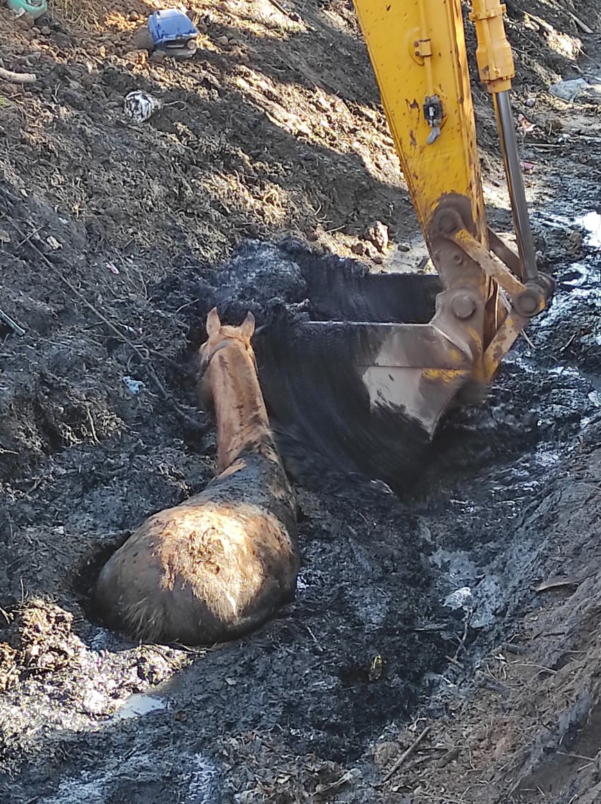 Un caballo que se encontraba atado, pastando, en zona del desagüe del ex Tiro Federal, quedó enterrado en el barro cuando bajó al canal para tomar agua. Estaba atado con una soga.