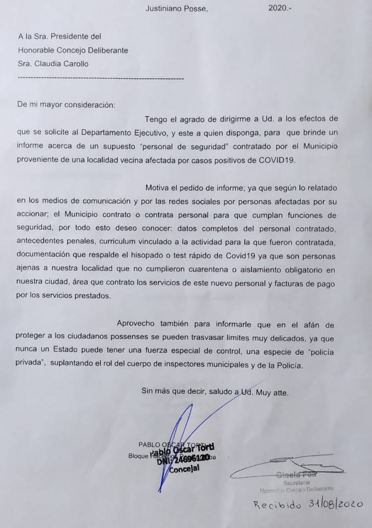 El concejal de la oposición Pablo Torti envió una nota dirigida a la presidenta del Concejo Deliberante, pidiendo información sobre el personal contratado. El edil peronista pidió saber datos completos del personal, antecedentes penales, currículum vinculado a la actividad para la que fueron contratados, documentación que respalde el hisopado o los test rápidos de covid-19, el área de la municipalidad que lo contrató y las facturas de pago por los servicios prestados. El dirigente opositor argumentó este pedido sosteniendo que no son de la localidad y no cumplieron la cuarentena o aislamiento obligatorio.