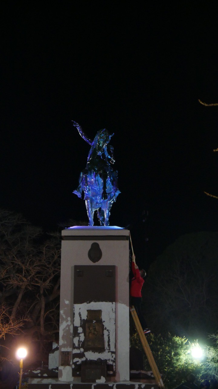 En esta oportunidad se aprovechó para iluminar la estatua con luces que están en la base de la misma. Ya se había limpiado y pintado en una primera etapa del trabajo. Con la pintura del monumento central de la plaza se avanzó en un proyecto aún más amplio de refuncionalización del lugar tras la intervención que se hizo desde el Departamento de Cultura Municipal con la supervisión de la Dirección de Obras Públicas.