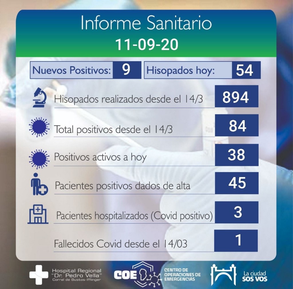 El viernes por la noche el Hospital Pedro Vella de Corral de Bustos Ifflinger emitió un comunicado de prensa informando 9 casos nuevos de COVID-19 en la ciudad. Los mismos determinaron la práctica preventiva de 54 hisopados más.