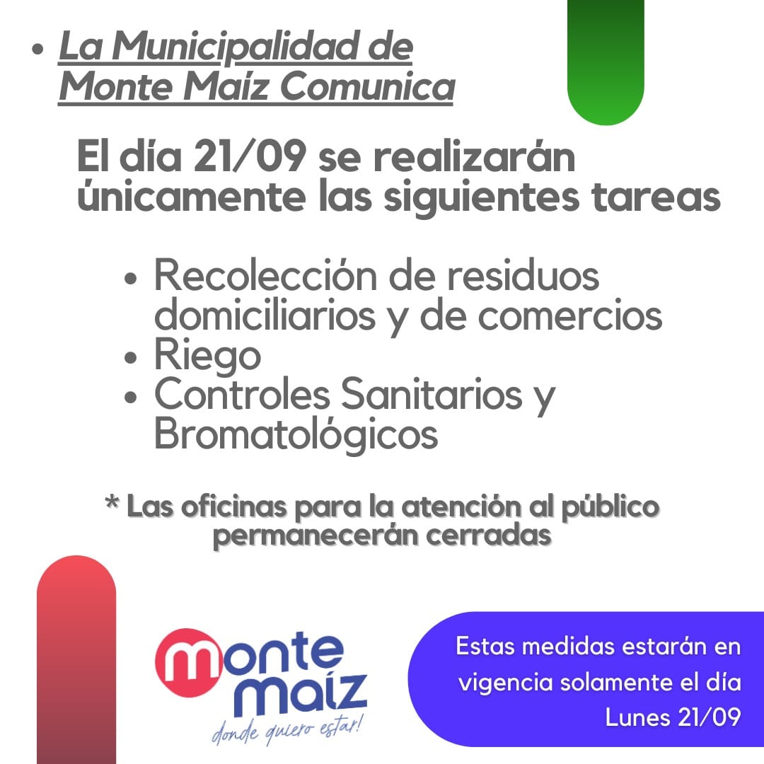 La Municipalidad de Monte maíz informó que hoy lunes 21 de setiembre no habrá atención al público. El edificio permanecerá cerrado.
