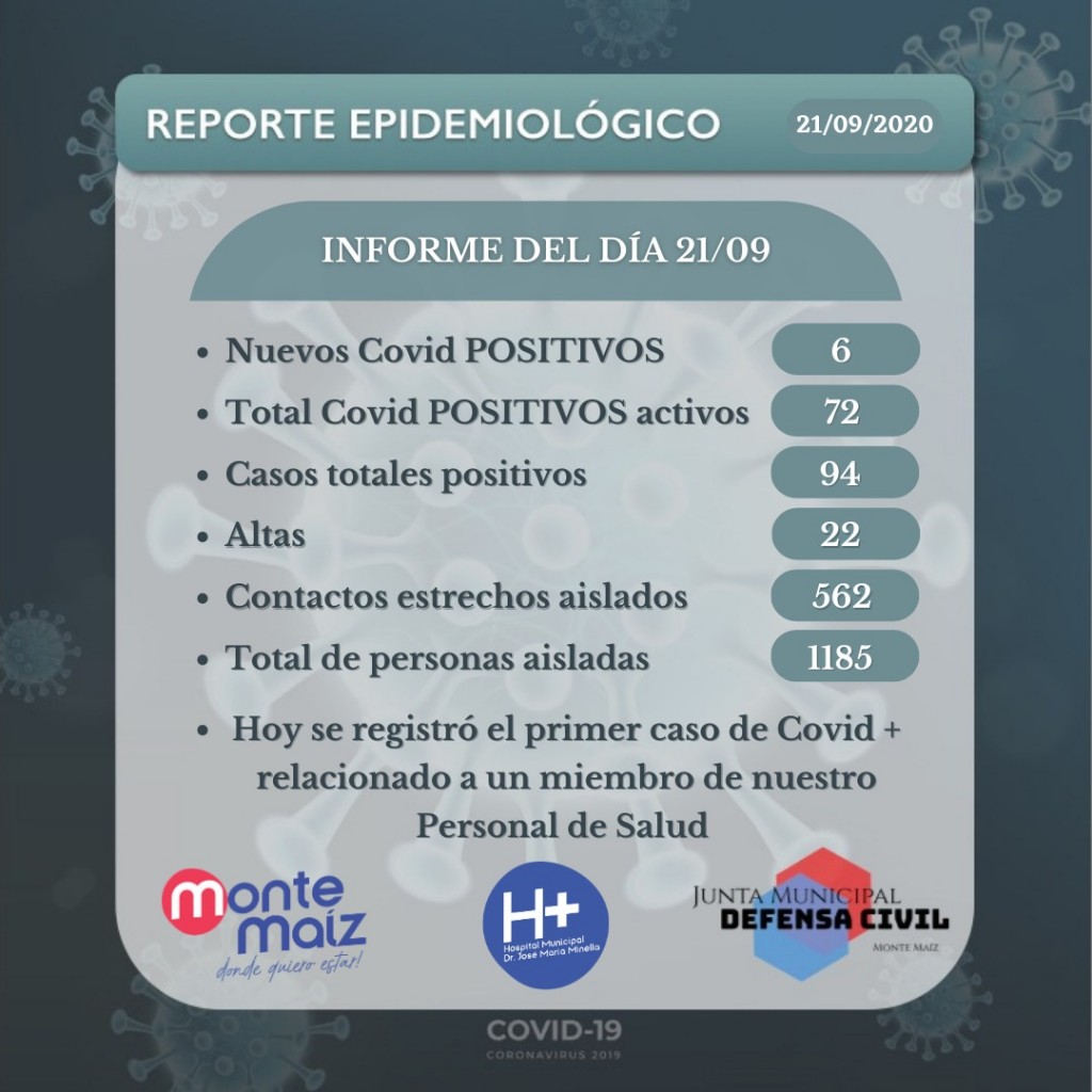 Los nuevos casos determinaron la práctica de 40 hisopados. A la fecha son 94 los casos de coronavirus en Monte Maíz. De los cuales 72 se encuentran activos mientras que 22 ya fueron dados de alta. Solo 2 casos necesitaron internación.