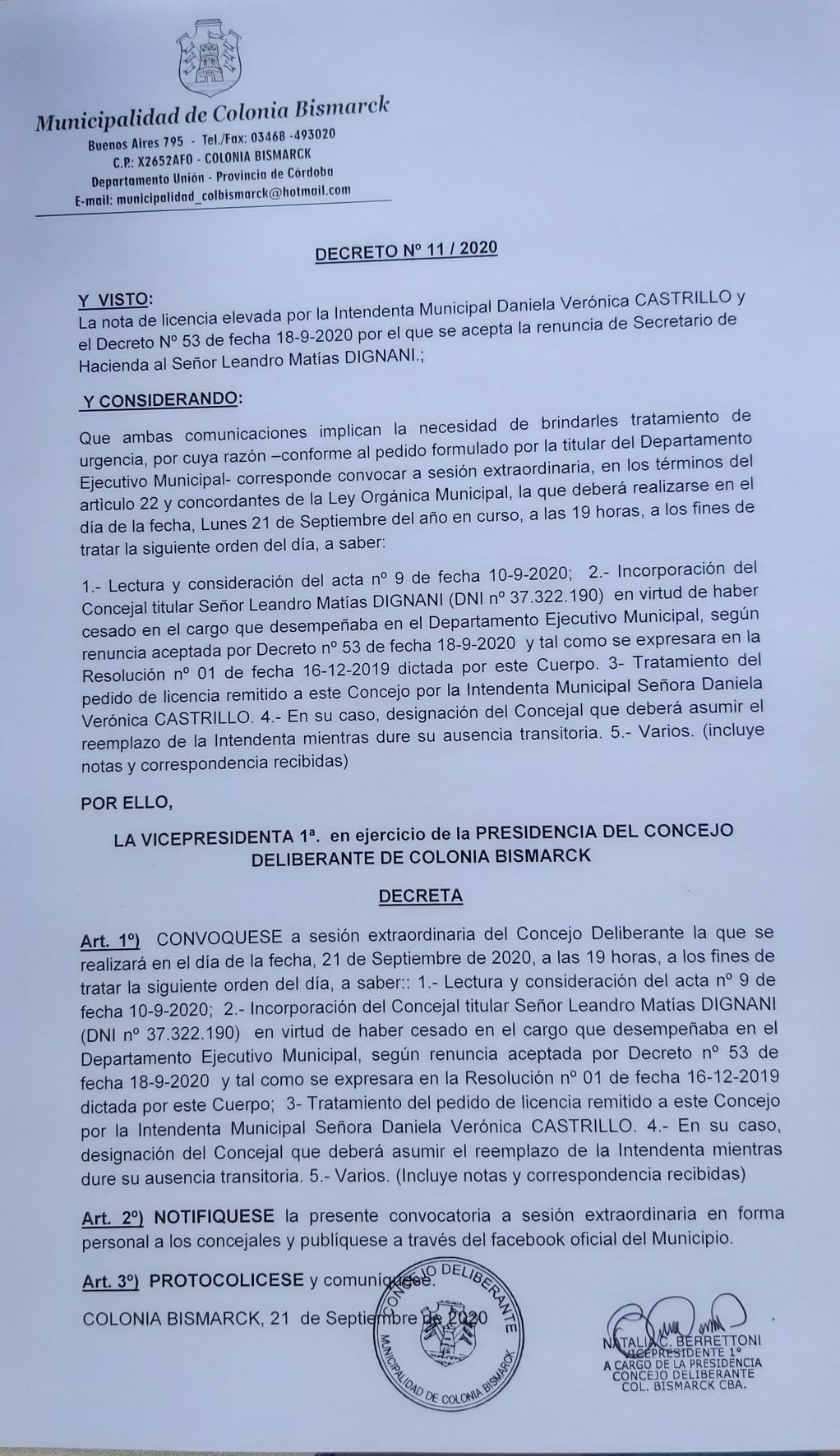 Tras sesión extraordinaria del Honorable Concejo Deliberante asumirá Leo Dignani, hijo de la Intendenta, quien actualmente ocupa la Secretaría de Hacienda y Finanzas del Municipio.