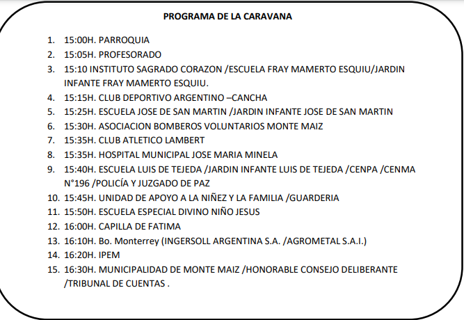 La imagen de la Virgen María que recorre nuestro pueblo una vez al año será trasladada por un vehículo de la Asociación Bomberos Voluntarios de Monte Maíz. Pasará por el frente de todas las instituciones de nuestra localidad en donde se rezará por ellas y se dará la Bendición. La procesión será transmitida por Radio Línea y vía web a través de multimediosmaldoni.tv. Aquellas emisoras que deseen tomar la transmisión también lo podrán hacer para que toda la población que lo requiera pueda participar de la ceremonia.