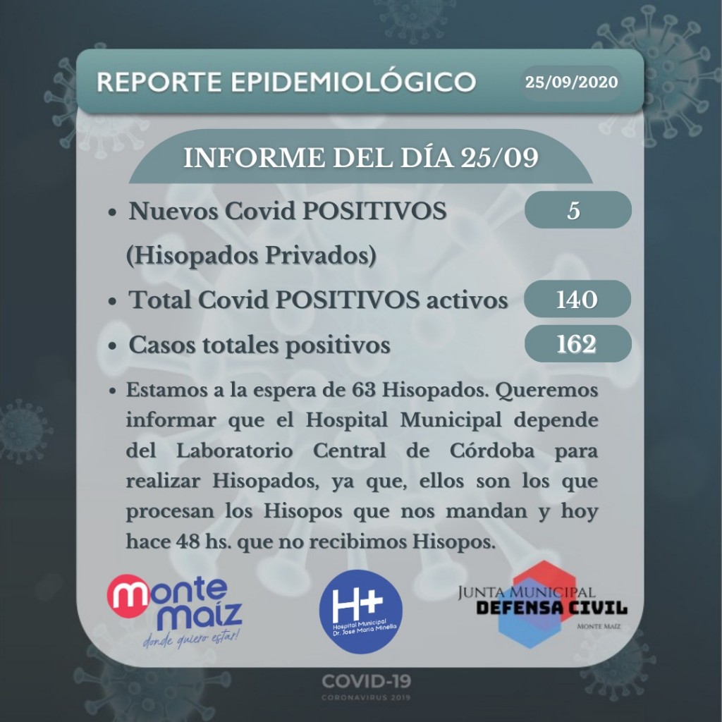 Aun se aguarda por el resultado de 63 hisopados practicados en el Hospital Municipal. El mismo depende del Laboratorio Central de la ciudad de Córdoba para realizar hisopados ya que ellos son los que procesan los hisopos que envían a Monte Maíz. Hoy hace 48 horas que no se reciben hisopos.