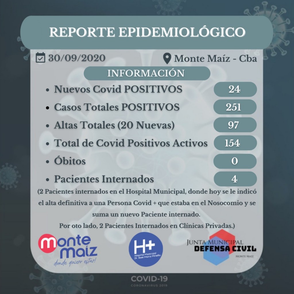 En el segundo informe oficial del día martes, el Hospital Municipal Dr. José María Minella informó sobre 24 casos más de COVID-19 en nuestra localidad. A la fecha se contabilizan 251 casos de coronavirus en Monte Maíz. De ellos, 154 son casos activos mientras que 97 superaron la enfermedad y fueron dados de alta. 4 pacientes se encuentran internados en el Hospital Municipal y dos en clínicas privadas.