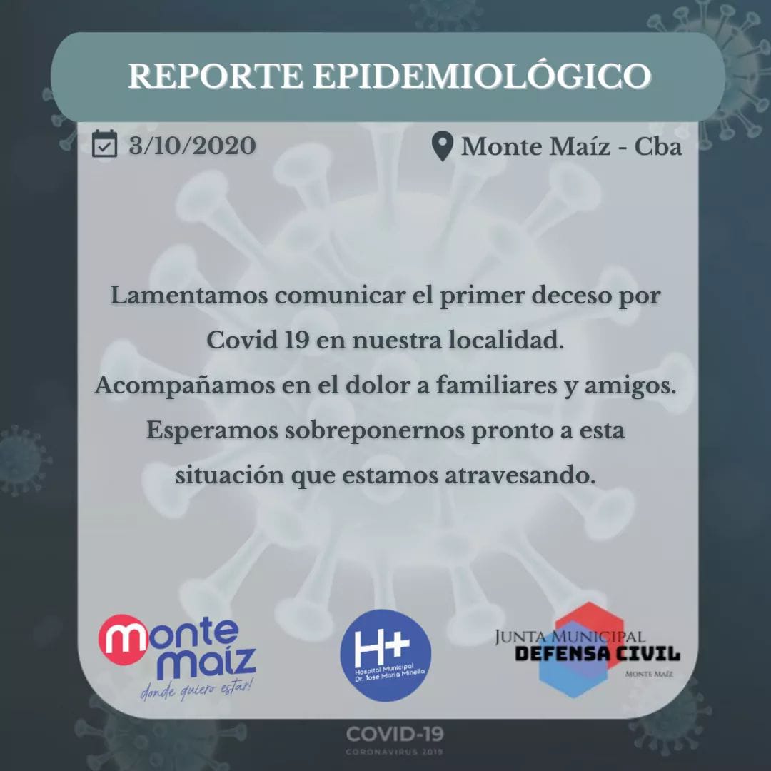 En el día de hoy se produjo el fallecimiento del primer paciente con COVID-19 de Monte Maíz. Se trata de un masculino, mayor de edad, quien presentaba patologías preexistentes. Sus restos fueron despedidos por sus más allegados en la madrugada de este sábado por cuestiones de protocolos sanitarios por Covid-19.