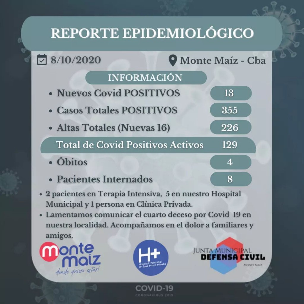 Desde el Hospital Municipal se informaron 13 casos más de COVID-19 en Monte Maíz. A la fecha, la suma total de casos es de 355. De los cuales, 129 son activos y 226 ya han superado la enfermedad.